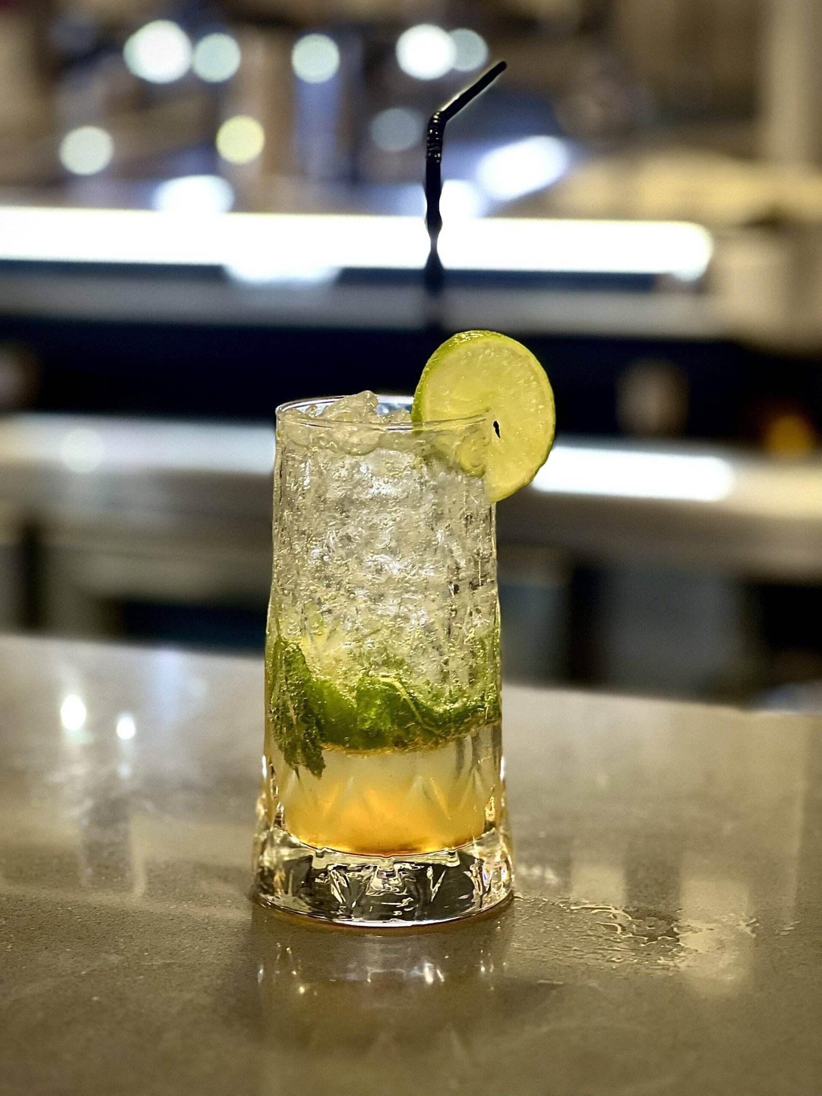 Lima, menta, hielo, sirope de arce y soda
