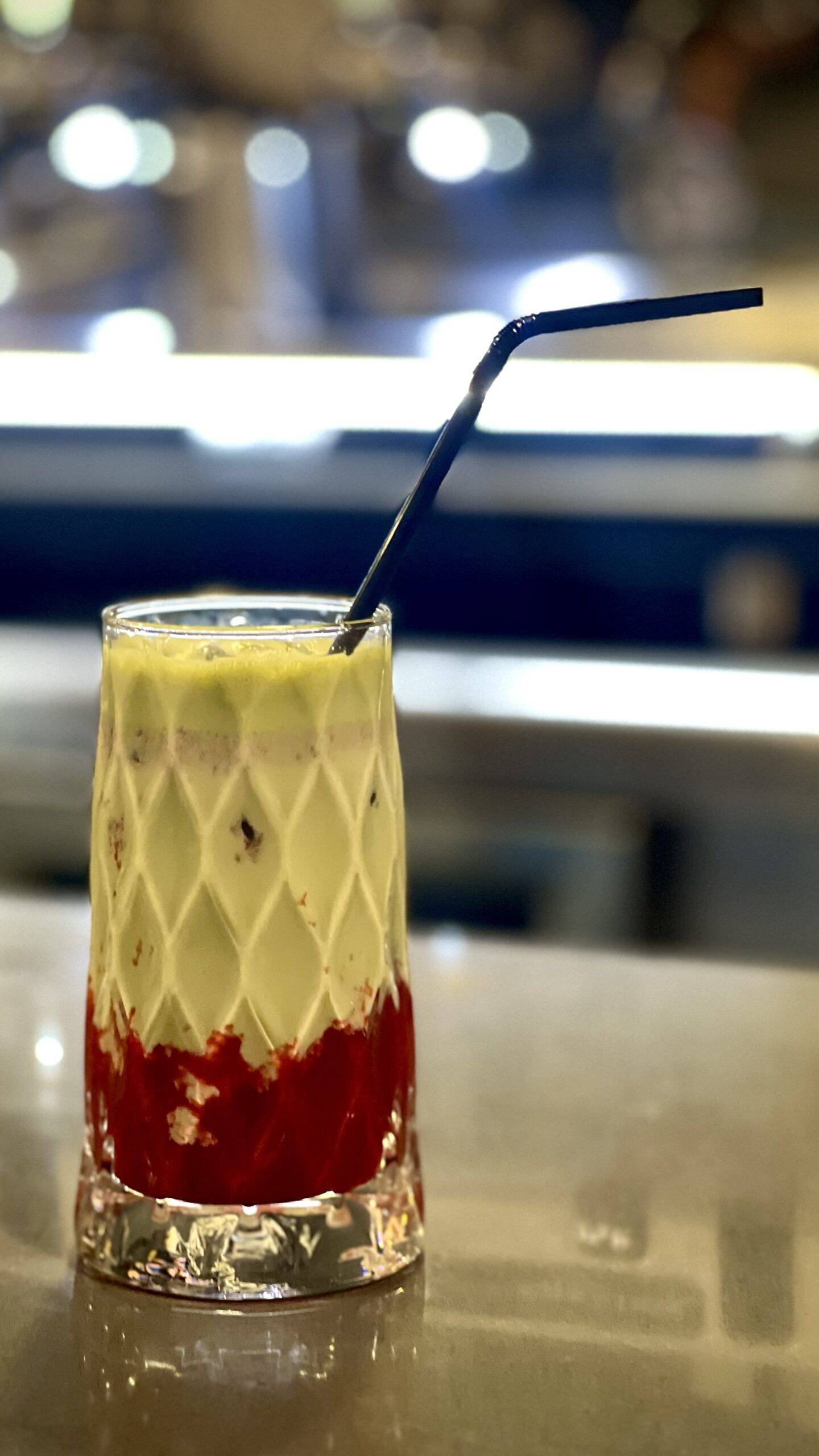 Puré de frambuesas, leche de soja, hielo y té matcha