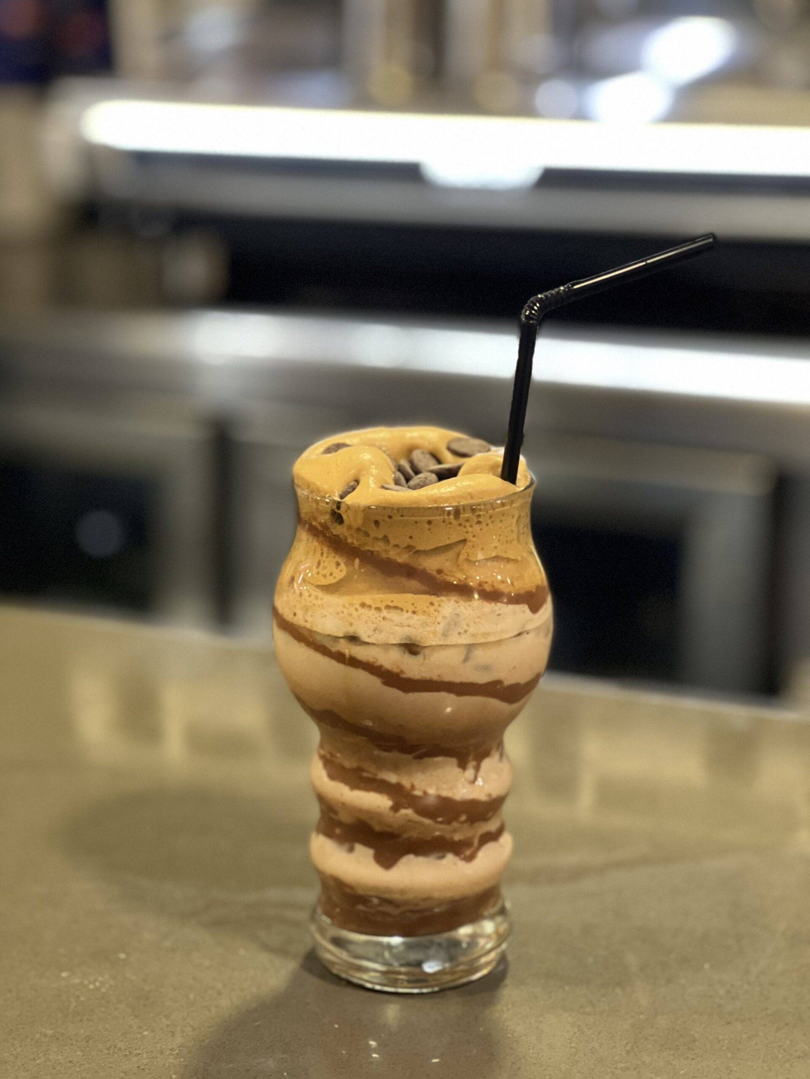 Ganache de chocolate, hielo, cacao en polvo, leche, café instantáneo, azúcar y pepitas de chocolate